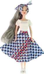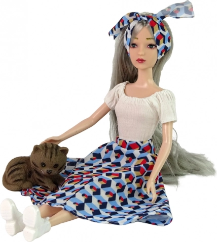 Scoprite il fascino della bambola EMILY con lunghi capelli grigi, occhi azzurri e cerchietto coordinato. Indossa un top bianco e una gonna svasata con motivo geometrico, abbinati a scarpe bianche. Nel set sono inclusi un tenero gattino e un’altalena bianca: ideali per scenette fantasiose e per prendersi cura del cucciolo.