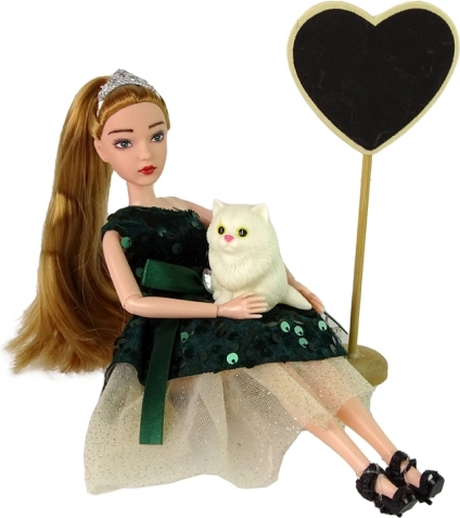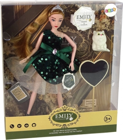 L'incantevole bambola Emily con abito verde bottiglia, paillettes e tiara arriva in set con un tenero gattino bianco e un grande cuore in legno su supporto. Grazie agli arti snodabili e all'ottima fattura stimola il gioco creativo e la fantasia dei bambini.