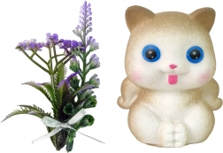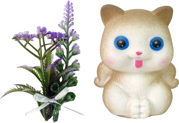 Il set include un piccolo gattino e un mazzo di fiori viola: ideali per inventare storie e decorare il mondo di gioco.