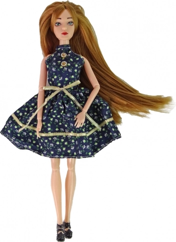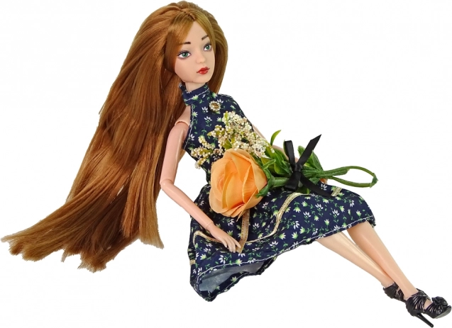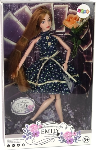 Emily ha capelli lunghi, splendidamente pettinati, un elegante abito floreale e scarpe nere con tacco. Nella confezione trovi anche una rosa ornamentale, che completa l'outfit per la sfilata di moda.
