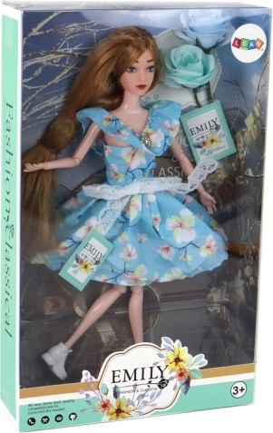 La bambola Emily (30 × 7 × 4 cm) è la compagna ideale per il gioco quotidiano. I lunghi capelli biondo scuro si pettinano e si decorano facilmente, così i bambini possono creare innumerevoli acconciature. L’abito blu con fantasia floreale è impreziosito da un fiocchetto in pizzo e da un piccolo dettaglio “diamante” allo scollo, che dona alla bambola un aspetto elegante.