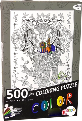 Immergiti nel mondo del divertimento creativo con 500 pezzi di puzzle in bianco e nero e 6 pennarelli per colorarli. Completa l'immagine di un elefante circondato da foglie e mettila in mostra come decorazione da parete o come sottopiatto.