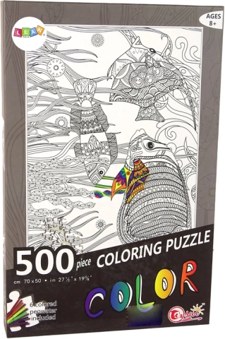 I puzzle da colorare offrono innumerevoli possibilità creative. Il set include 500 pezzi di puzzle in bianco e nero e 6 pennarelli, con cui puoi personalizzare l'immagine a tuo piacimento. Il puzzle mostra pesci nell'oceano, circondati da piante.