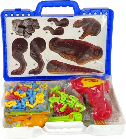 - Manuale, valigetta, 2 pannelli con parti del corpo del dinosauro, 8 pannelli con figure, viti e coprivite colorati in plastica, trapano giocattolo, cacciavite, 2 chiavi