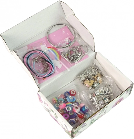 Include inoltre 30 perline colorate in plastica e fino a 60 perline nelle finiture argento e oro con adorabili motivi di animali, piante e altri disegni per bambini. La confezione elegante con design floreale dona al set un fascino speciale ed è ideale come regalo.