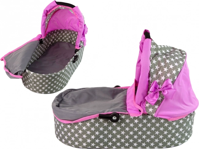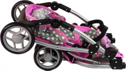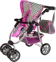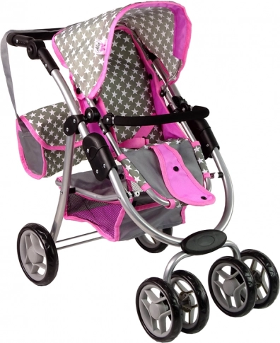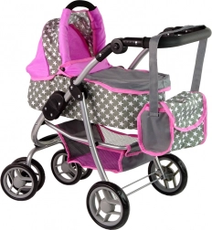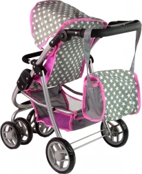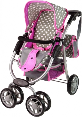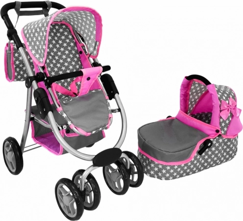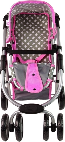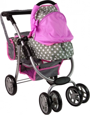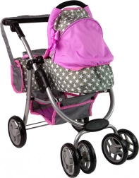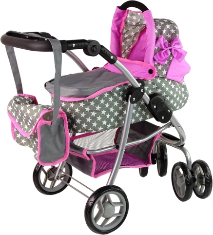 La carrozzina combina i colori rosa e grigio con un motivo a stelle, conferendo al gioco delle mamme un aspetto realistico.