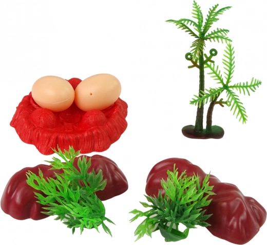 Troverai inoltre tre piccoli dinosauri che aggiungono dinamica e varietà al gioco. Accessori come due rocce, due cespugli e due uova offrono uno sfondo autentico per il gioco e la base con essi rende lo scenario ancora più realistico. Un albero completa il set e supporta la creazione di storie in un ambiente naturale.