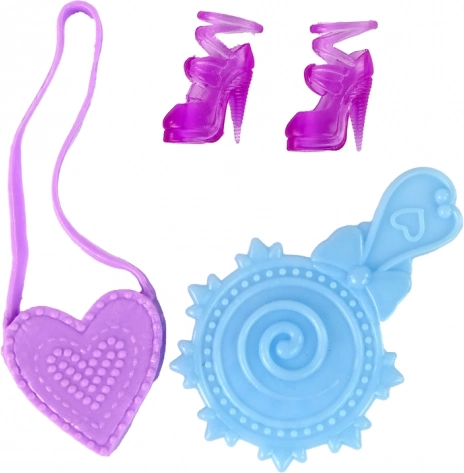 Il set include tacchi rosa, una borsa a forma di cuore e un accessorio rotondo blu: tutto coordinato con l’outfit della bambola e perfetto per ampliare le possibilità di gioco.