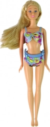 La bambola con lunghi capelli biondi e costume da bagno floreale estivo è pronta per le calde giornate estive.