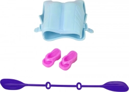 Includono anche un giubbotto di salvataggio blu, sandali rosa e pagaia viola per un'esperienza realistica.