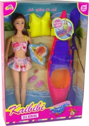 Il burattino nel set ha un elegante costume da spiaggia a due pezzi e lunghi capelli castani, che lo rendono un compagno ideale per qualsiasi gioco d'immaginazione.