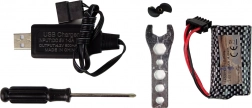 Il set include anche accessori come cavo per batteria, chiave, cacciavite, supporto per il motoscafo per stabilizzarlo a terra e un’elica.