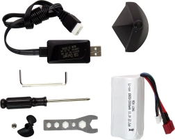 Nella confezione trovi batteria, caricatore USB, elica di ricambio, attrezzi e supporto: tutto per una partenza rapida e una manutenzione semplice.