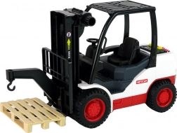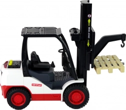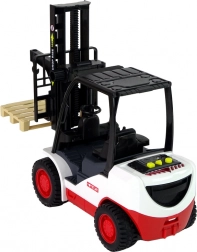 Carrello elevatore giocattolo realistico in rosso e bianco con luci e suoni, sollevamento funzionante e pallet rimovibile. Stimola la motricità fine, la creatività e il gioco di fantasia. Struttura in plastica robusta, ruote posteriori a trazione per avanzare senza spingere, materiali sicuri e certificazioni.