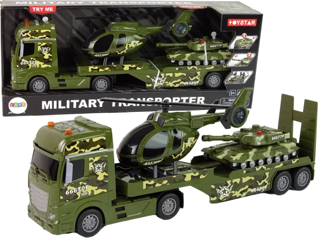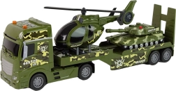 Questo set dettagliato propone tre amati veicoli militari in un design mimetico coordinato: camion con rimorchio rimovibile, elicottero con rotori girevoli e carro armato con meccanismo a frizione. Grazie ai dettagli realistici, alle parti mobili e agli effetti luminosi e sonori, i bambini creeranno facilmente missioni avventurose tutte loro.