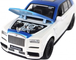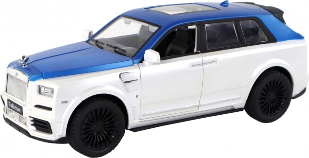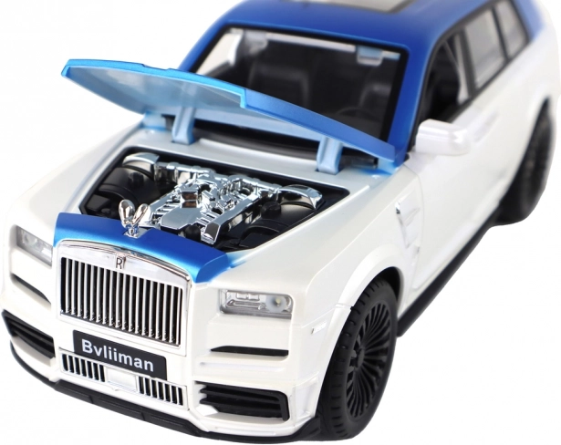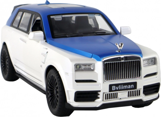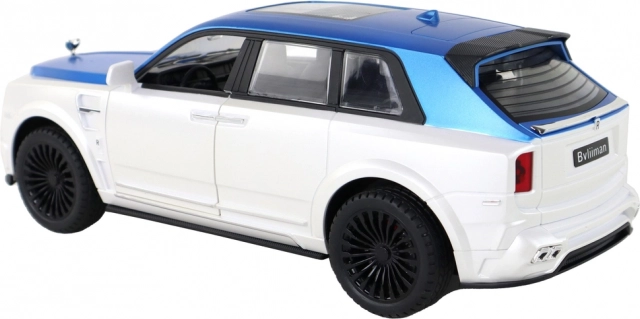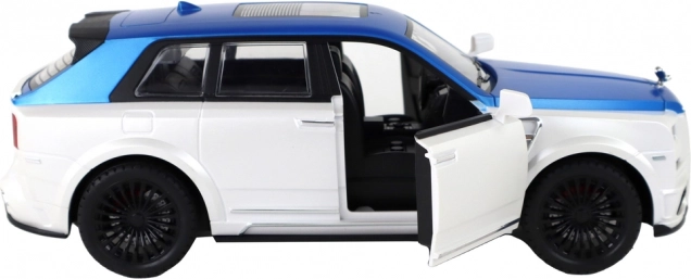 Carrozzeria bianco-blu con dettagli argentati e porte funzionanti per un aspetto autentico, come un vero SUV.