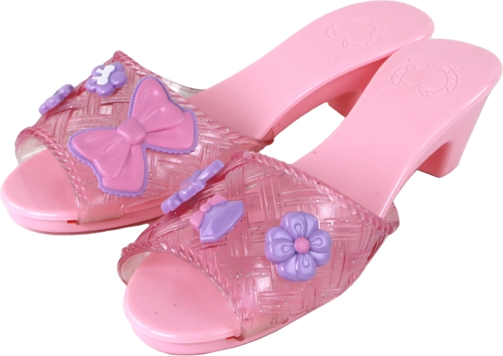 I sandalini rosa con tacco e i divertenti ornamenti completano il look finale e donano sicurezza in ogni sfilata di moda a casa.