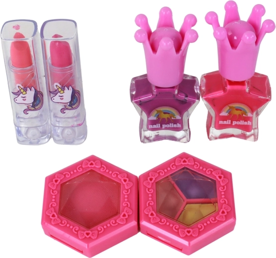 - Valigetta con unicorno, sandalini rosa con tacco, 5× pennello per trucco, fard, 3× ombretti, 2× smalto per unghie (rosa, viola), 2× separadita, 2× rossetto, confezione originale