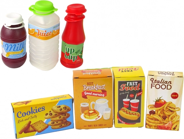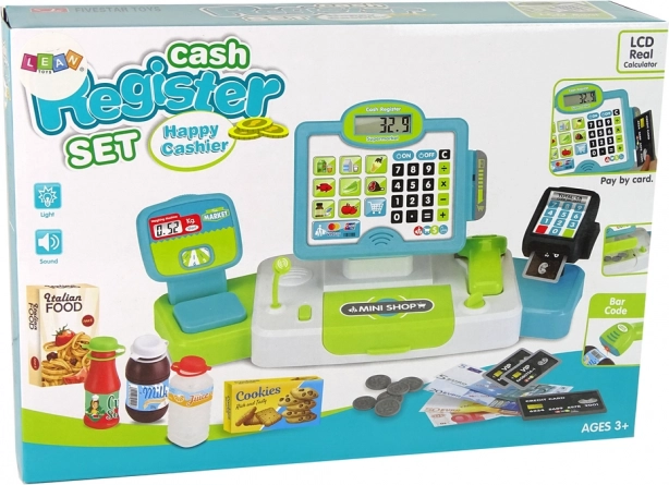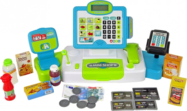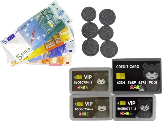 Il set include anche soldi, carte e vari prodotti che permettono ai bambini di simulare gli acquisti e sviluppare le abilità matematiche.