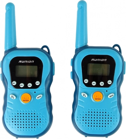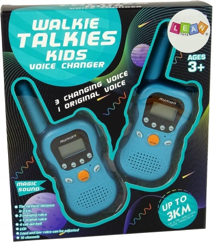 Divertenti ricetrasmittenti per bambini di colore blu offrono comunicazione interattiva fino a 3 km di distanza. Dispongono di 16 canali, cambio timbro della voce (femminile, maschile, robot), comando semplice con il pulsante TALK e funzione di suoneria. Ideali per piccoli esploratori e per giocare all’aperto e in casa.