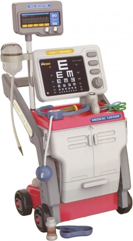 Questo attraente set medico in bianco e rosa entusiasmerà tutti i piccoli amanti della medicina. Include una postazione mobile, un stetoscopio funzionante a batteria (3×1,5 V, non incluse), una siringa, forbici e altri accessori indispensabili. Gli adesivi decorativi donano alla postazione un aspetto autentico.