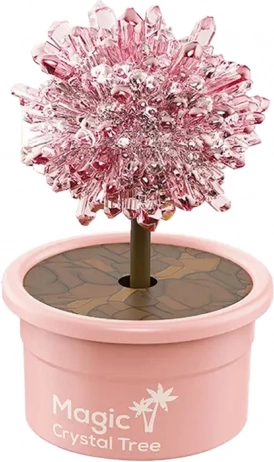 Il kit include un misurino, polveri cristalline e altri strumenti. Basta seguire le istruzioni e osservare come sull’alberello crescono scintillanti cristalli rosa.