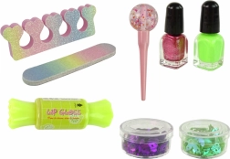 Questo splendido set cosmetico contiene molti elementi attraenti che delizieranno ogni giovane appassionata di stile. Un separatore cosmetico aiuta durante la verniciatura delle unghie, mentre due lucidalabbra aggiungono fascino e lucentezza. Una limetta e tre smalti per unghie, di cui due con glitter e uno di colore acceso, permettono decorazioni creative delle unghie con diversi motivi.