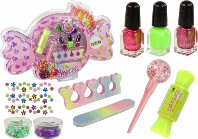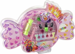 Sono incluse anche adesivi decorativi e due contenitori con paillettes decorative, ideali per creare decorazioni d'effetto. È un set completo per piccole artiste della cosmetica.