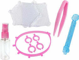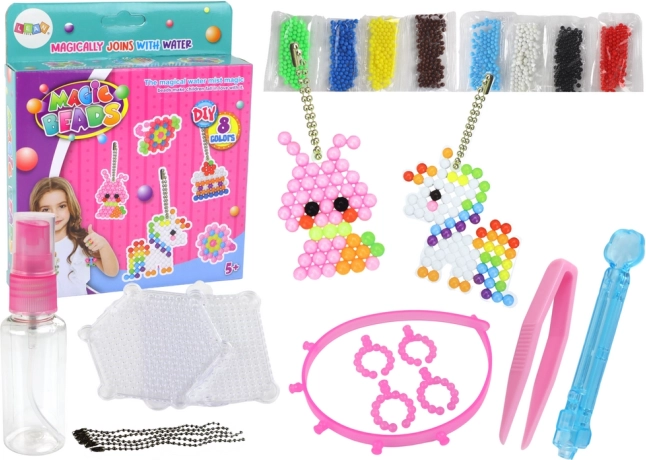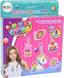 Le perline ad acqua sono piccole sfere colorate che, dopo una spruzzata d’acqua, si uniscono in un unico pezzo – senza colla né ferro da stiro. I bambini possono creare infiniti motivi, personaggi e decorazioni e trasformarli in ciondoli o addobbi per la cameretta.
