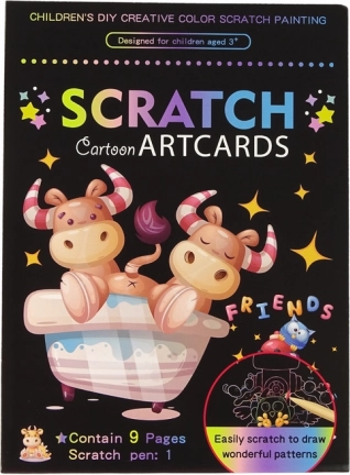 Questo set creativo porta ai bambini gioia di gioco e apprendimento. Basta prendere lo stilo in legno, grattare delicatamente lo strato nero e sotto appariranno bellissime scene colorate con animaletti. Le dimensioni delle schede si adattano perfettamente alla mano dei bambini, facilitando la presa e la manipolazione.