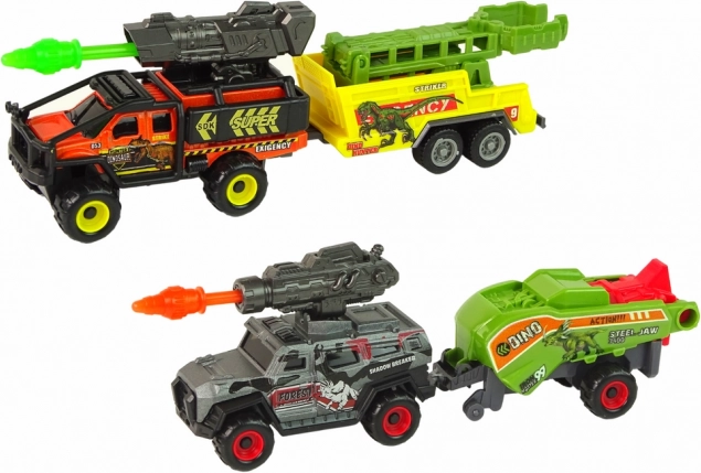 Questo set include due veicoli giocattolo con rimorchi per il trasporto dei dinosauri. Ogni veicolo è dotato di un lanciatore rotante, che aggiunge un elemento di azione al gioco. La lavorazione dettagliata di questi veicoli rende il gioco ancora più interessante.