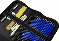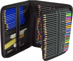 - 72 pastelli; 12 matite in grafite di diversa durezza; carboncini in 3 durezze; 3 sfumini + pulitore; gomma; temperino; prolunga per matite