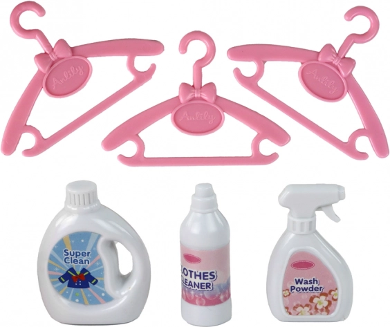 Bambola ANLILY, lavatrice, cesto per il bucato, 3 appendini, 3 abiti, 3 boccette di “detersivo”, confezione originale