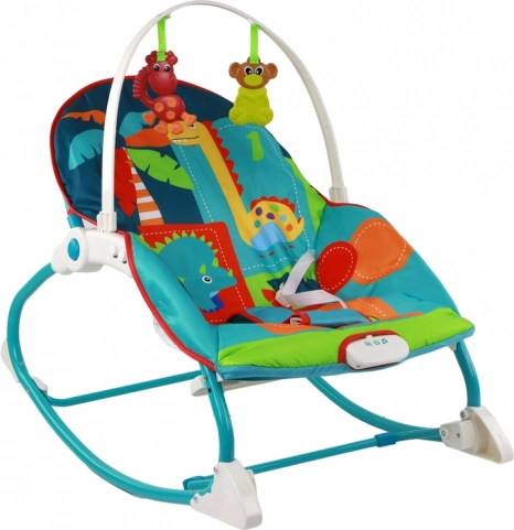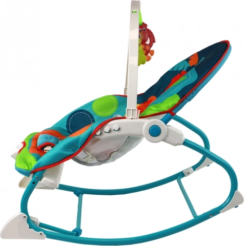 La sdraietta presenta un design allegro con motivi di dinosauri ed è disponibile nei colori verde e blu, creando un ambiente accogliente per il bambino.