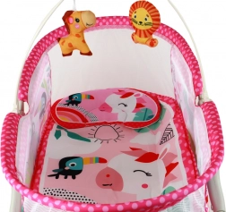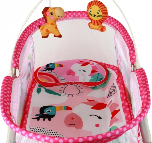 Questa culla rosa con motivi di animali allegri offre un posto sicuro e tranquillo per il riposo.