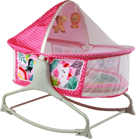 La culla multifunzionale con altalena 2 in 1 offre non solo uno spazio confortevole per dormire, ma anche un tappetino e un'altalena in uno. Il colore rosa crea un ambiente amichevole per i bambini e, grazie alla rete e al tetto, protegge il bambino dagli insetti e dal sole, consentendo un sonno tranquillo all'aria aperta. La possibilità di trasformare l'altalena in una culla stabile distendendo i piedini offre ulteriore versatilità.