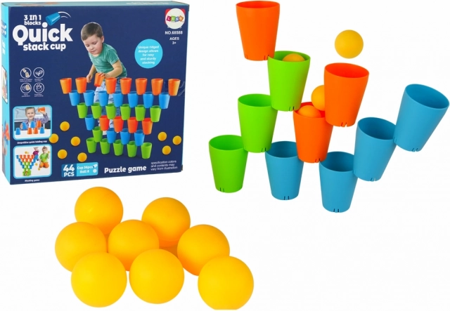 Bicchierini impilabili 3 in 1 offre divertimento per i tuoi bambini. Il set contiene 44 pezzi: 12 bicchieri blu, 12 arancioni e 12 verdi più 8 palline gialle per giocare. Sviluppa la creatività e la coordinazione del tuo bambino.