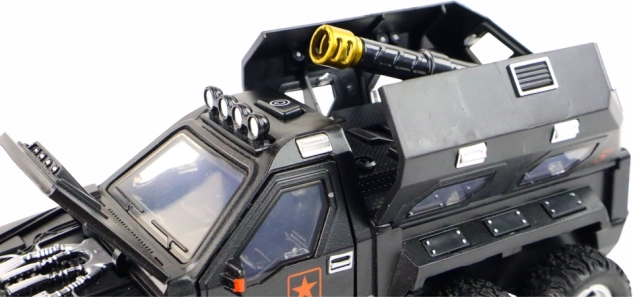 Questo fuoristrada militare conquista per la cura dei dettagli e per le funzioni che stimolano il gioco creativo. Premendo il pulsante si aprono le porte e dalla parte superiore fuoriesce un cannone realistico, accompagnato da effetti luminosi e sonori. Il meccanismo a frizione (a inerzia) garantisce un controllo semplice – basta spingerlo e il veicolo prosegue da solo. Le ruote in gomma assicurano scorrevolezza silenziosa e ottima aderenza su varie superfici.