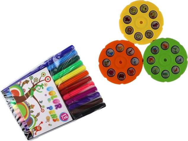 La confezione include 3 dischi di proiezione con diverse immagini, 12 pennarelli colorati, un blocco note e una pratica base–organizer, che mantiene tutti i componenti in ordine. Il giocattolo supporta la motricità fine, allena l’immaginazione e aiuta i bambini a conoscere gli animali giocando.