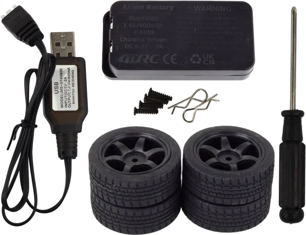 Guida confortevole con volante e grilletto dell’acceleratore, trasmissione stabile senza interferenze e accessori pratici: caricatore USB, batteria Li‑ion, pneumatici di ricambio e utensili.