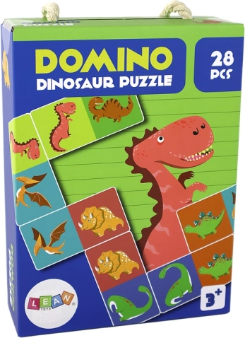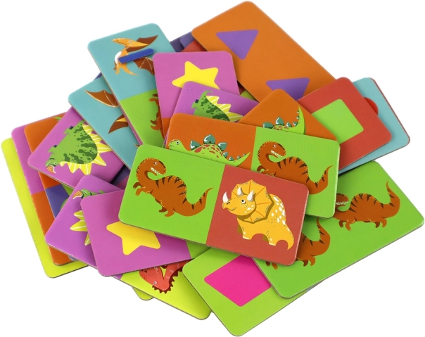 Presentiamo il set educativo Gioco logico Puzzle Domino Dinosauri. Questo set contiene 28 elementi, ciascuno dei quali mostra metà di un dinosauro. Il tuo bambino può sviluppare il pensiero logico e la concentrazione creando diverse immagini di dinosauri.