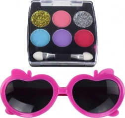 2× rossetto (rosso), palette ombretti (rosa, viola, blu, glitter argento e oro), 2× palette per contouring, occhiali rosa per bambine a forma di cuore, pennelli per trucco, separatore per le dita, lima per unghie, 2× smalto per unghie, custodia in plastica a donut con catenella