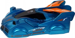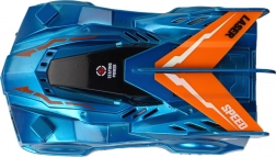 L'auto blu con linee taglienti e decorazioni "LASER" e "SPEED" si distingue per velocità e resistenza.