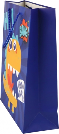 Elegante borsa regalo in carta di colore blu scuro con un simpatico dinosauro e un delicato scintillio che dona al tuo regalo un aspetto speciale. Le robuste maniglie in cordoncino intrecciato garantiscono un trasporto confortevole, ideale per compleanni, festività e altre feste per bambini.