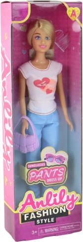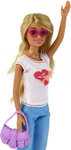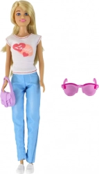 La bambola indossa una maglietta bianca con motivo cuore/labbra, pantaloni blu e sneakers bianche. La borsetta viola e gli occhiali da sole rosa permettono di creare diverse combinazioni di stile per ogni occasione.