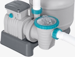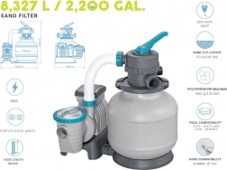 Questa pompa con portata di 8327 litri all’ora è adatta a piscine con capacità da 1.100 a 54.500 litri. Per il funzionamento richiede sabbia al silicio n. 20 (0,45–0,85 mm) oppure le sfere filtranti ad alta efficienza POLYSPHERE.