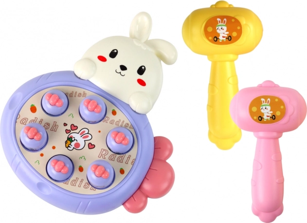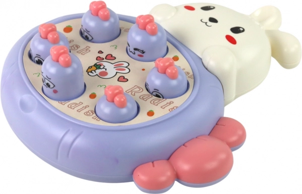 Le immagini animate del coniglietto creano un'atmosfera giocosa. Il set contiene un pannello speciale su cui sono posizionate sei carote. Le carotine spuntano casualmente da diversi fori sul pannello, rendendo il gioco più avvincente e imprevedibile.