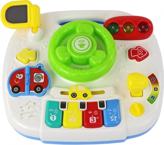 Questo colorato tavolino interattivo funge da giocattolo 2 in 1: come tavolino autonomo con gambe oppure come pannello sospeso sul lettino grazie ai pratici ganci. Il fulcro del gioco è il volante per bambini con frecce, clacson e segnalazione luminosa, che aiuta a imparare le basi dell’educazione stradale e la coordinazione mano-occhio.