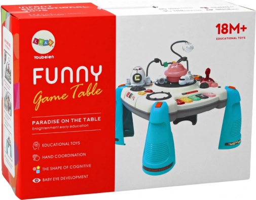 Il tavolo è dotato di gambe rimovibili, il che consente l'uso direttamente sul pavimento, e contiene elementi sonori per lo sviluppo degli interessi musicali. Questo tavolo educativo è quindi la soluzione ideale per i bambini da 18 mesi di età.