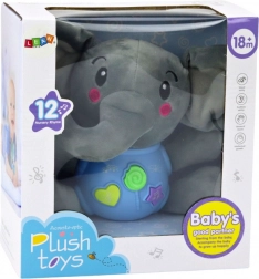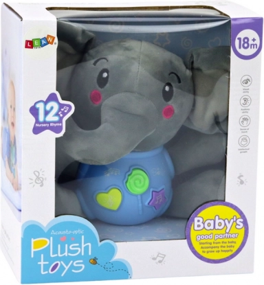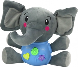 Adorabile elefante di peluche interattivo di colore blu (19 cm) in materiale morbido offre tre pulsanti: suoni della natura, filastrocche in inglese e 5 allegre melodie. Ottimo giocattolo per lo sviluppo dei sensi e del linguaggio da 18 mesi, alimentazione 2× AA.